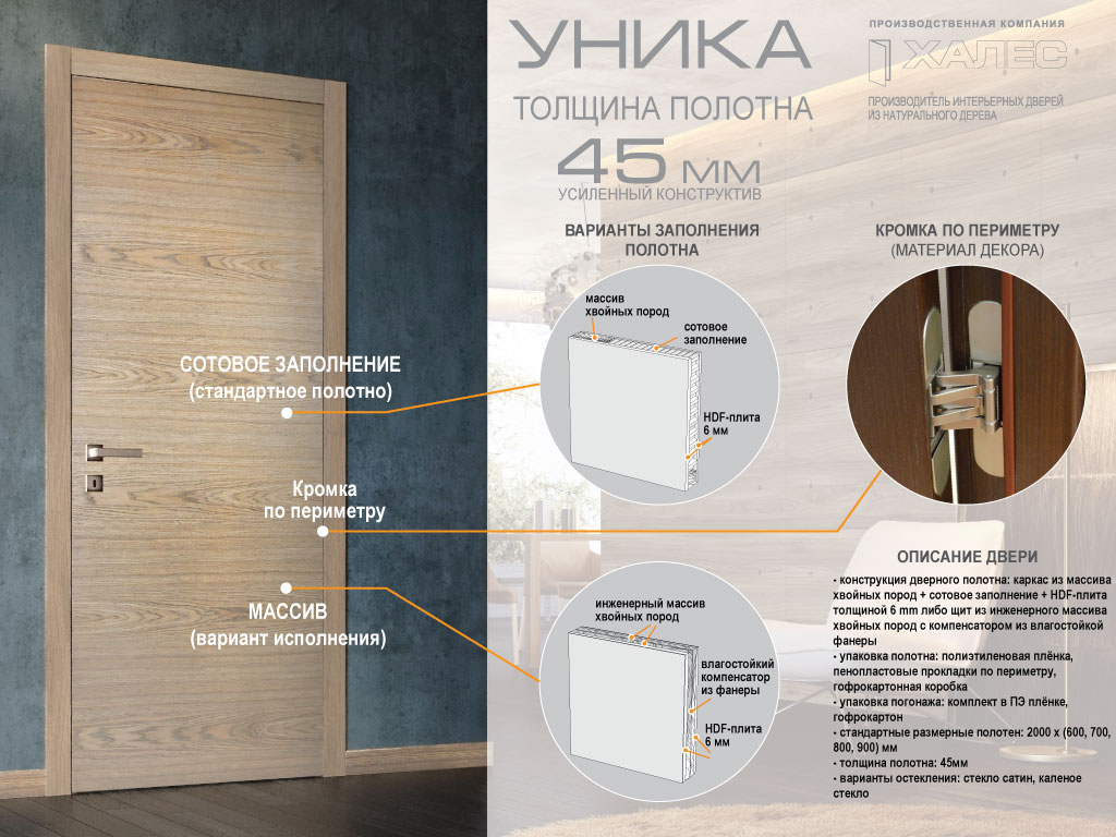 Предлагается две конструкции полотна: стандартное с сотовым заполнение и усиленное с компенсатором из влагостойкой фанеры и инженерным массивом хвойных пород. Преимущество усиленного полотна очевидны - устойчивость к повышенным нагрузкам во время эксплуатации, также улучшаются эксплуатационные свойства полотен высотой 2400 и 2900 мм, делая их более устойчивыми к физическим нагрузкам как базовой версии полотна, и уж тем более усиленного каркаса.